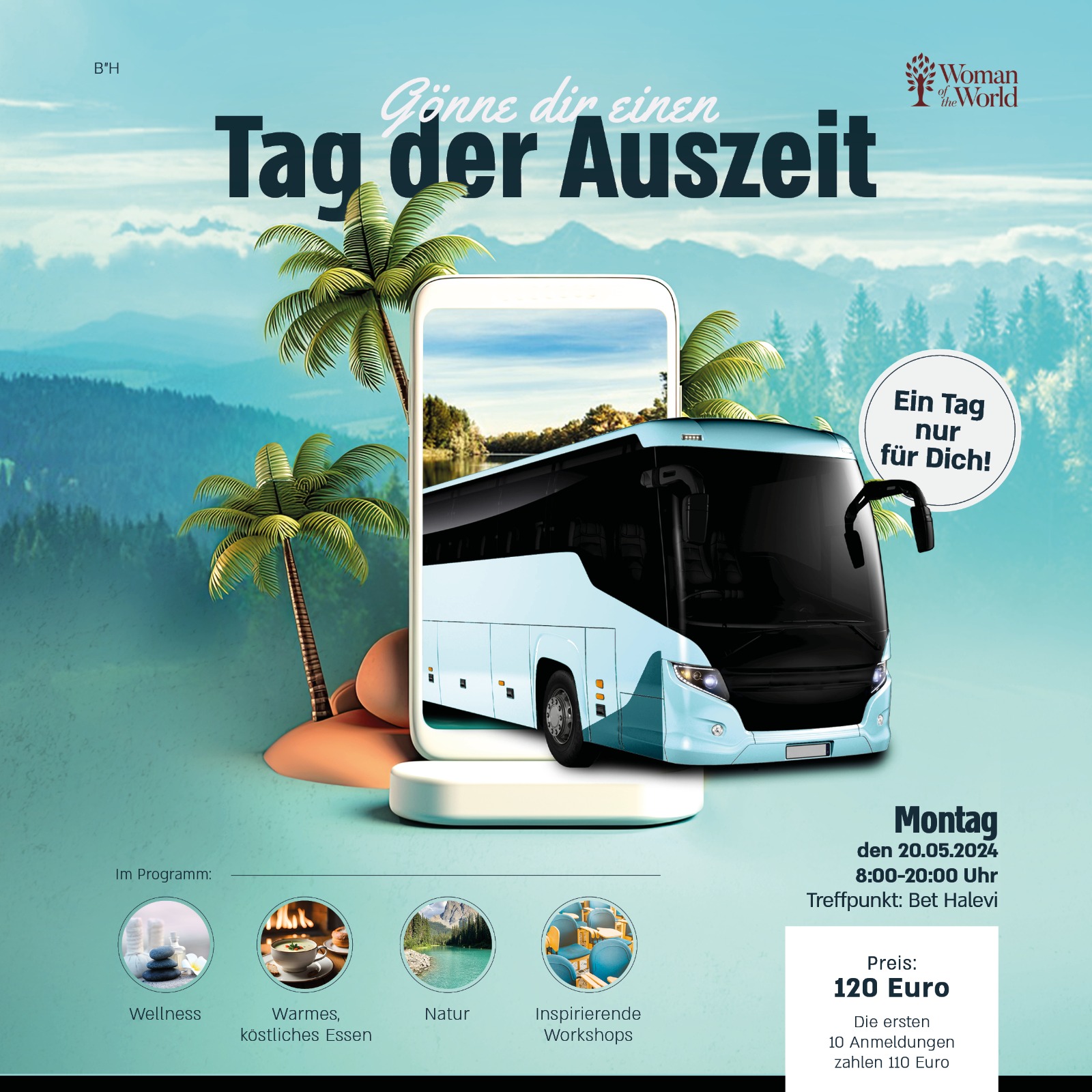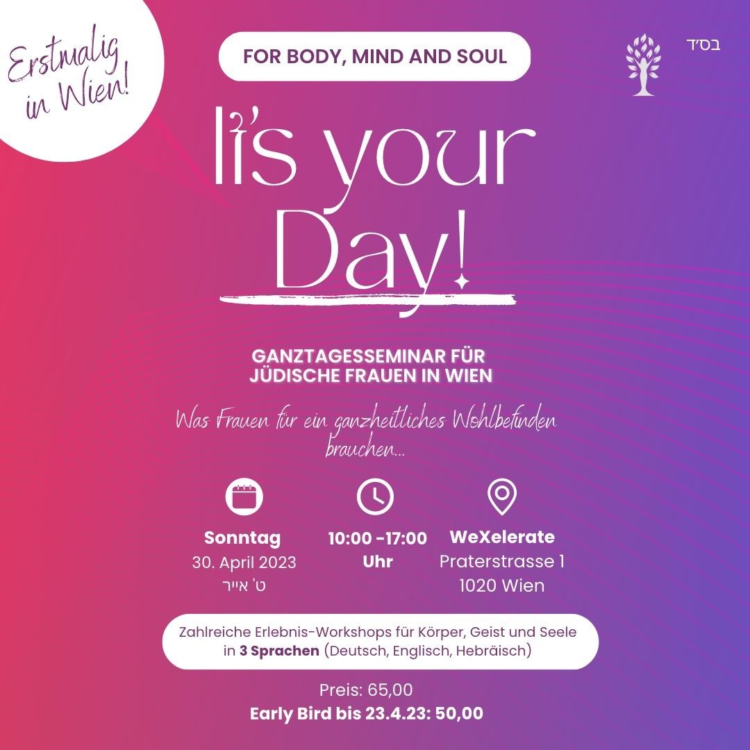 Zahlreiche Erlebnis-Workshops für Körper, Geist und Seele in 3 Sprachen (Deutsch, Englisch, Hebräisch), Warmes Mittagessen, Wohlfühl- Stände zum Entdecken